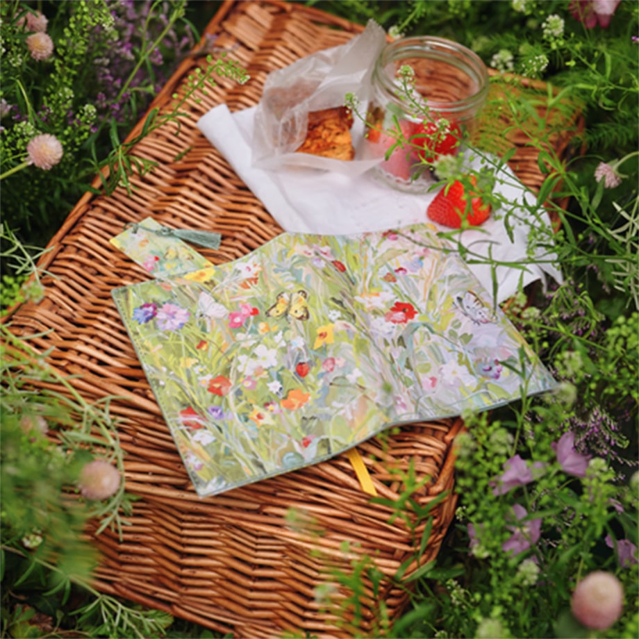 淡いグリーンをベースに色とりどりの花々が描かれたデザインは、読書の時間をさらに特別にしてくれます。