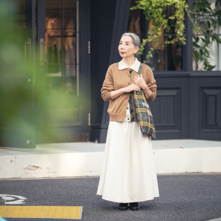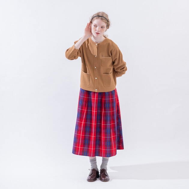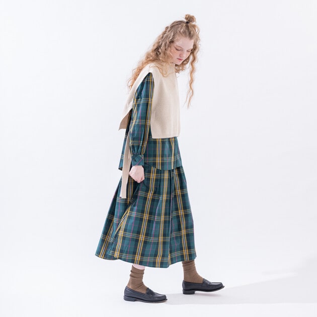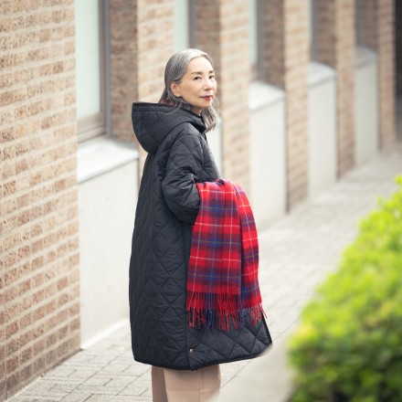 普段の装いは無地やブラックが多いです。これまでチェックは可愛くなりすぎるのではと思い手に取らなかったのですが、今回30年ぶりくらいに着ました。思いのほか自分に馴染み、驚きました。濃い色のチェックとグレーヘアーの相性がよく、似合う年齢になったのかもしれません。また、しっかりメイクとタータンの組み合わせも新鮮で気に入りました。