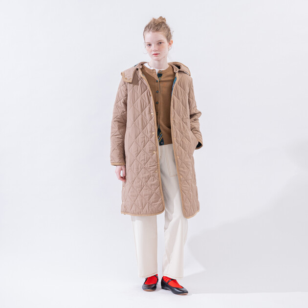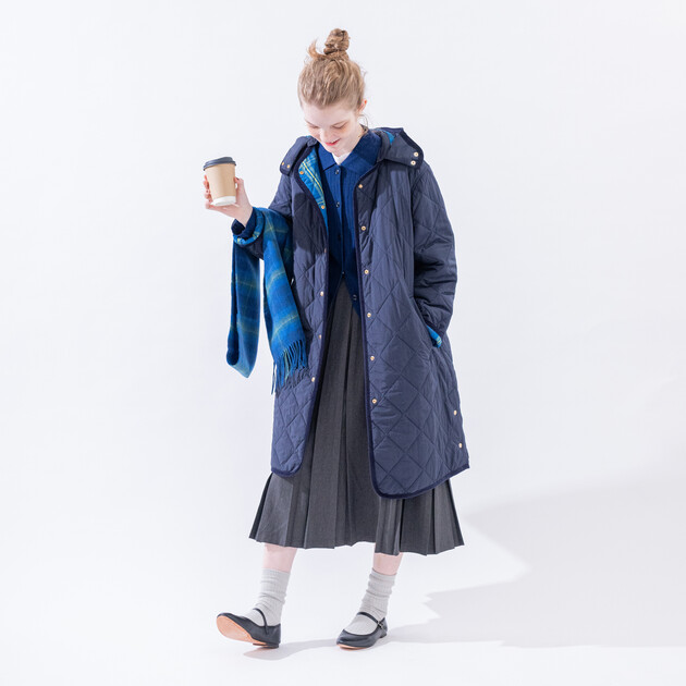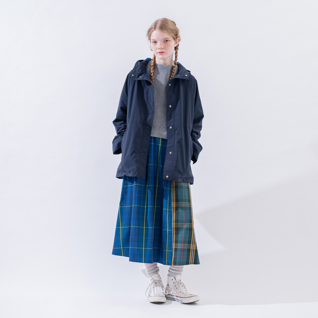 フードの内側のタータンが退屈になりがちなアウターコーデのポイントに。