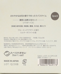 | サイズ | 【箱】縦13cm/横9cm/厚み4cm 【パウダーバス】縦10.7cm/横8cm/内容量20g×3包 |