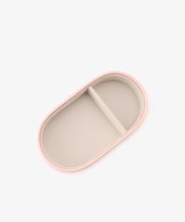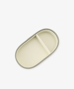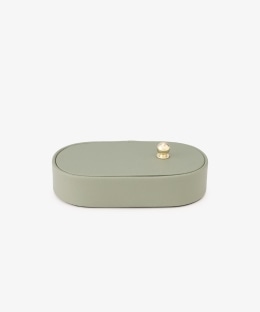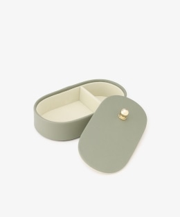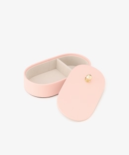 アクセサリーを大切に保護しつつ、インテリアとしても楽しめるジュエリーボックスです。丸みを帯びた楕円型に設計し、風合い豊かなフェイクレザーを使用して高級感のある風合いに仕上げました。モダンな雰囲気漂うおしゃれなデザインなので、インテリアの一部としても飾ることができます。ゴールドカラーのつまみが付いた蓋は取り外してシンプルなトレーとしても使用可能です。内側は腕時計やバングルなどの大きめの物でも収納できるよう、仕切りを最低限にしています。カラーはニュアンスのあるカーキとピンクの2色展開。お好きな色で選ぶのはもちろん、色違いで並べたりサイズをミックスしたりしてディスプレイするのもおすすめです。