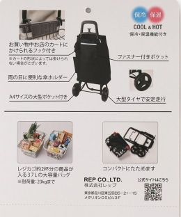 | 商品注意事項 | 【ご購入に際しましてのご案内】バックと本体と車輪は組み立て式となります。 重量は約1.95kgとなります。 耐荷重量/20kg 20kg以上の重さの荷物を載せないでください。 この製品はショッピングカートです。歩行を補助するための歩行補助車ではありません。 簡易的な保温・保冷製品ですので、長時間なま物を入れたままにしないでください。 付属の注意書きをよく読みお使いください。 1点ごとに柄の出方が違うことがあります。 |
