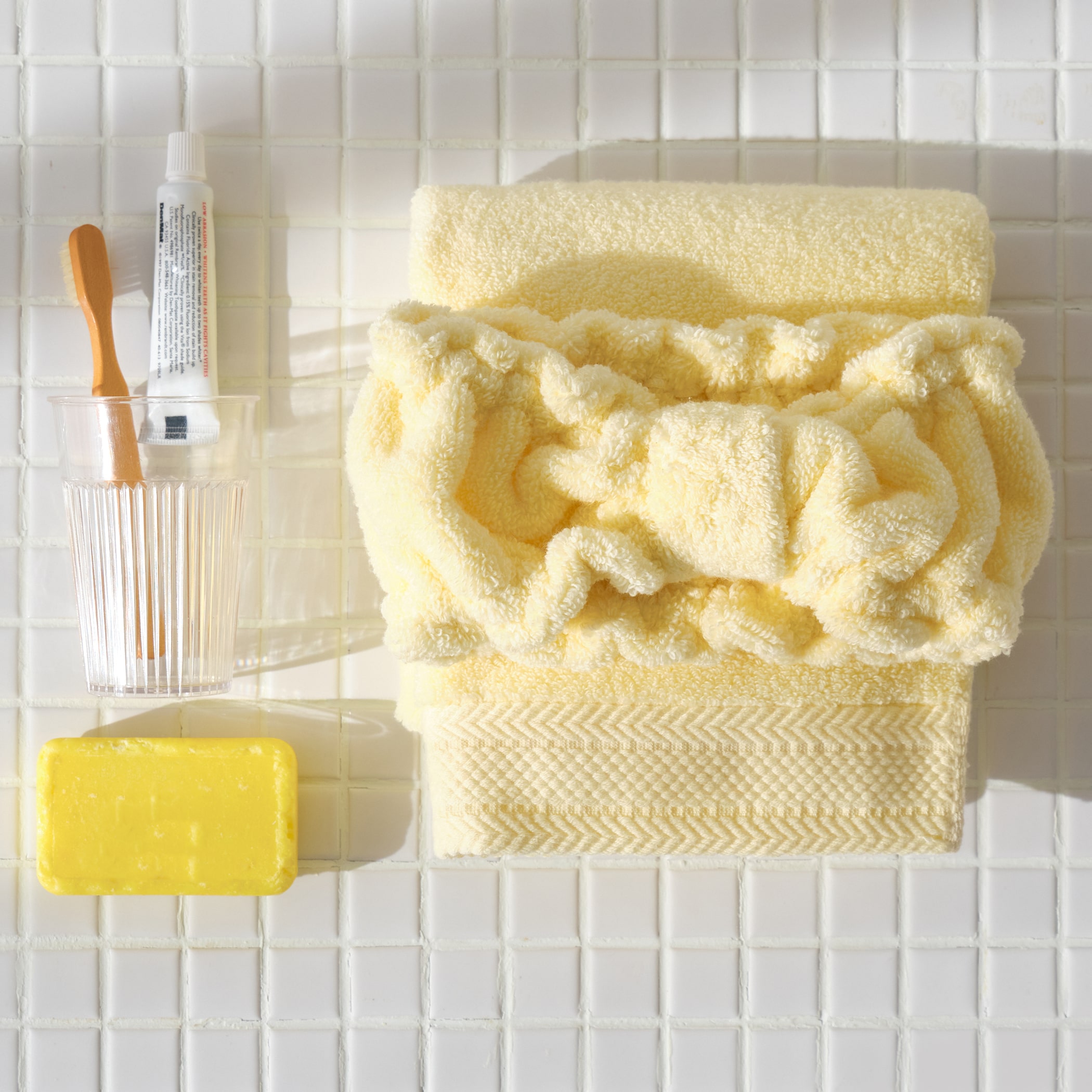 ・肌に触れる部分は綿素材で、乾きにくい地組織の一部にポリエステルを使用することで綿100%のタオルと比べて乾燥時間を約20%短縮(当社調べ)