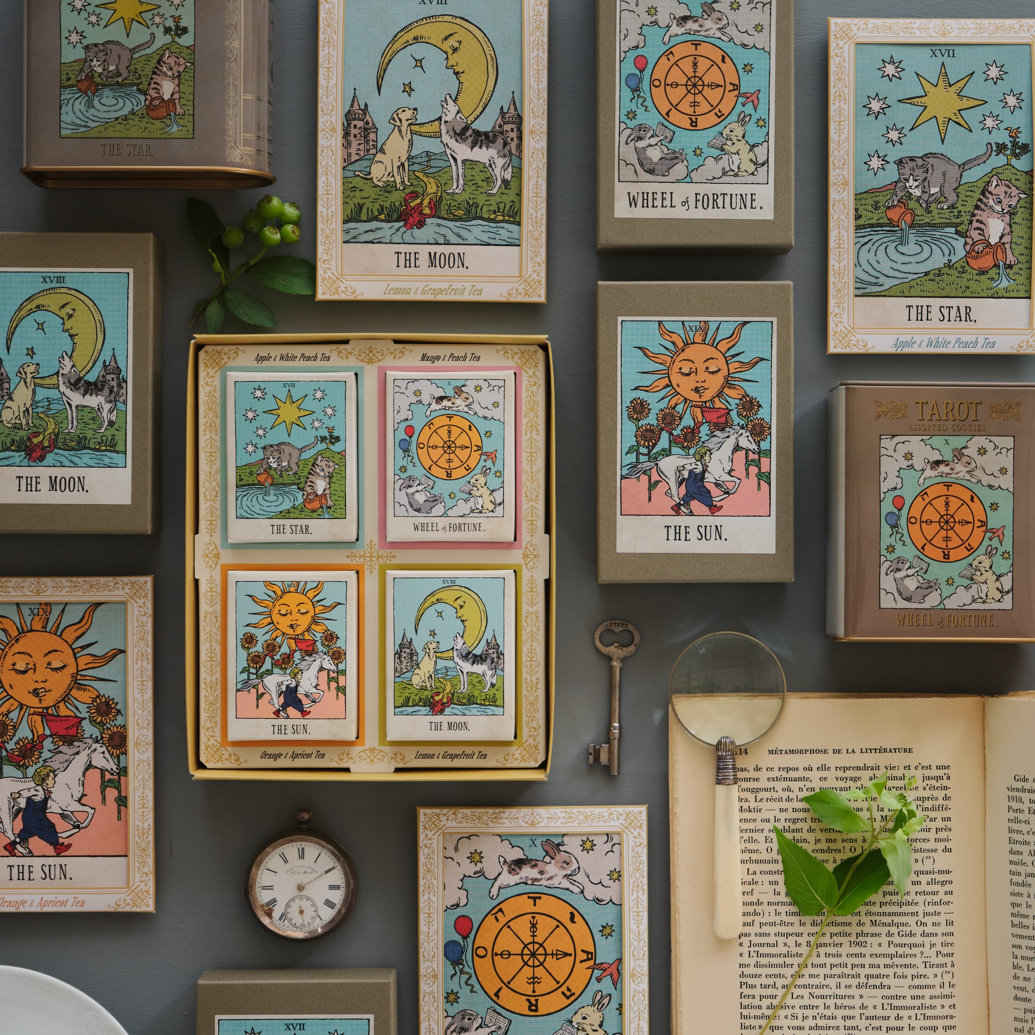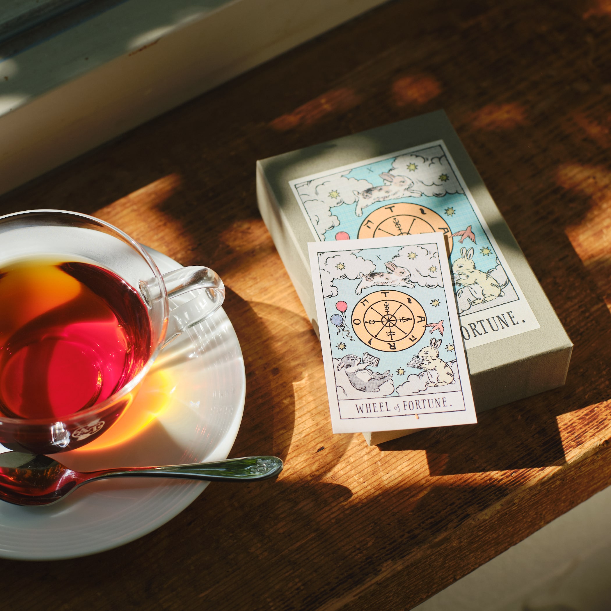 タロットカードをモチーフに、アフタヌーンティーらしい解釈を添えてデザイン。 愛らしい動物たちや美しい風景がアーティスティックに描かれ、視覚的にも楽しませてくれます。 ティータイムを楽しんだあとは、アート部分を絵葉書サイズのカードとして飾ることも。 自分へのご褒美にも、大切な人へのギフトにもぴったりの一品です。