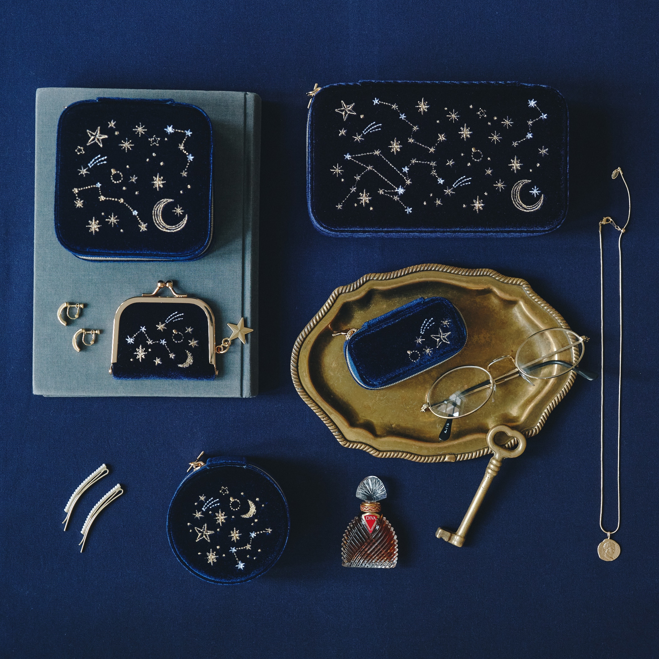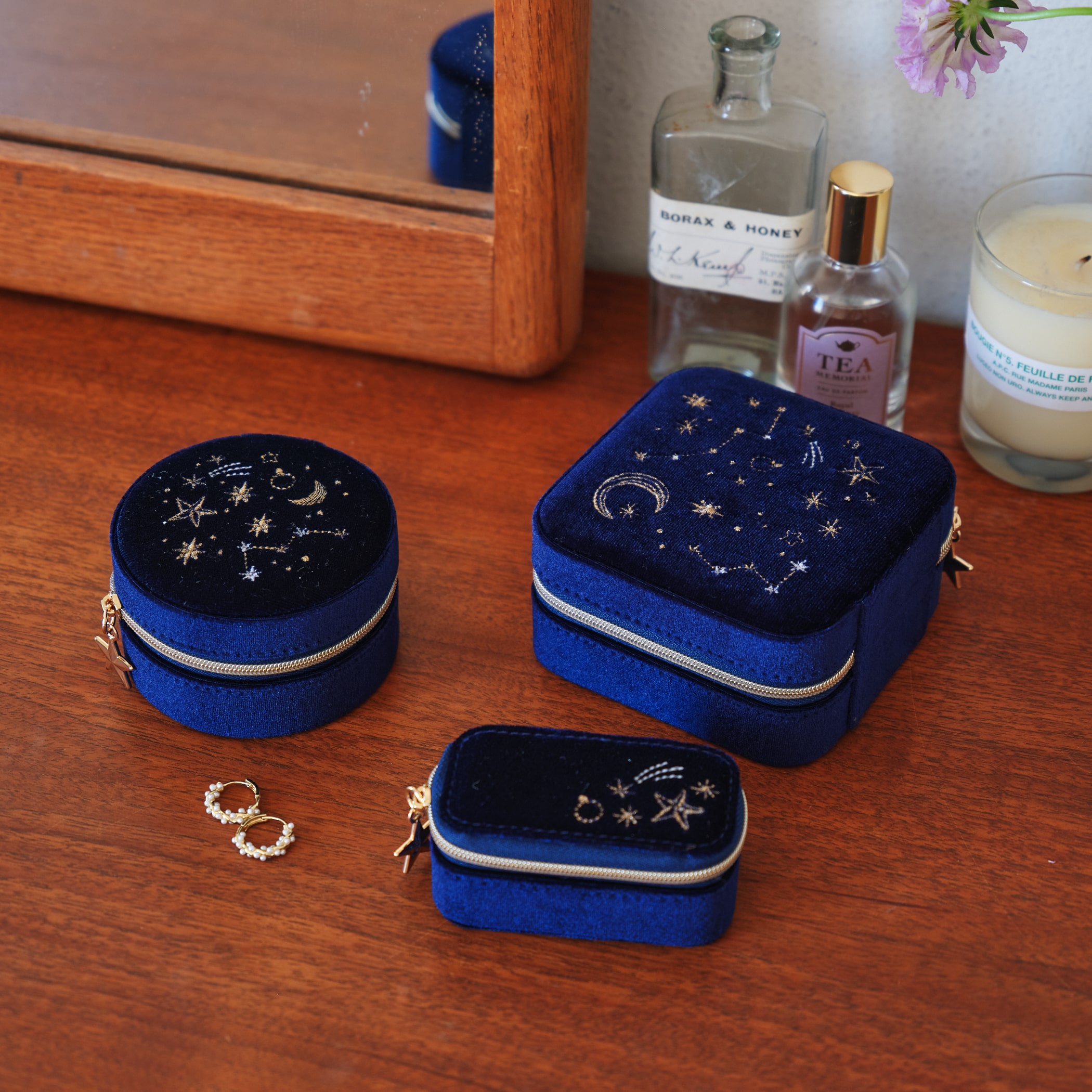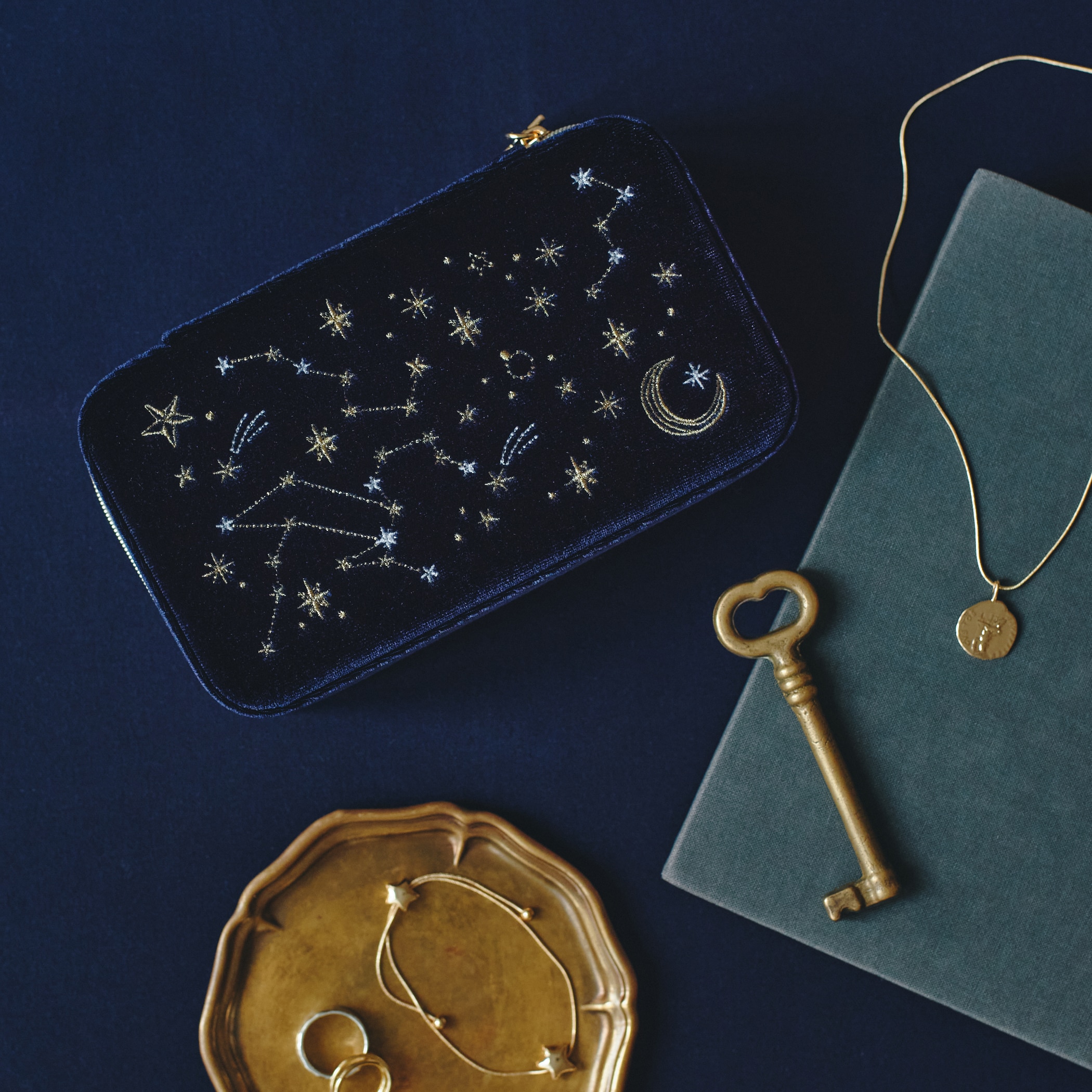 人気の天体モチーフのジュエリーボックスシリーズ。深い色合いのベロアに繊細な刺繍で天体アートをあしらい、煌めく星形のチャームをプラスしました。