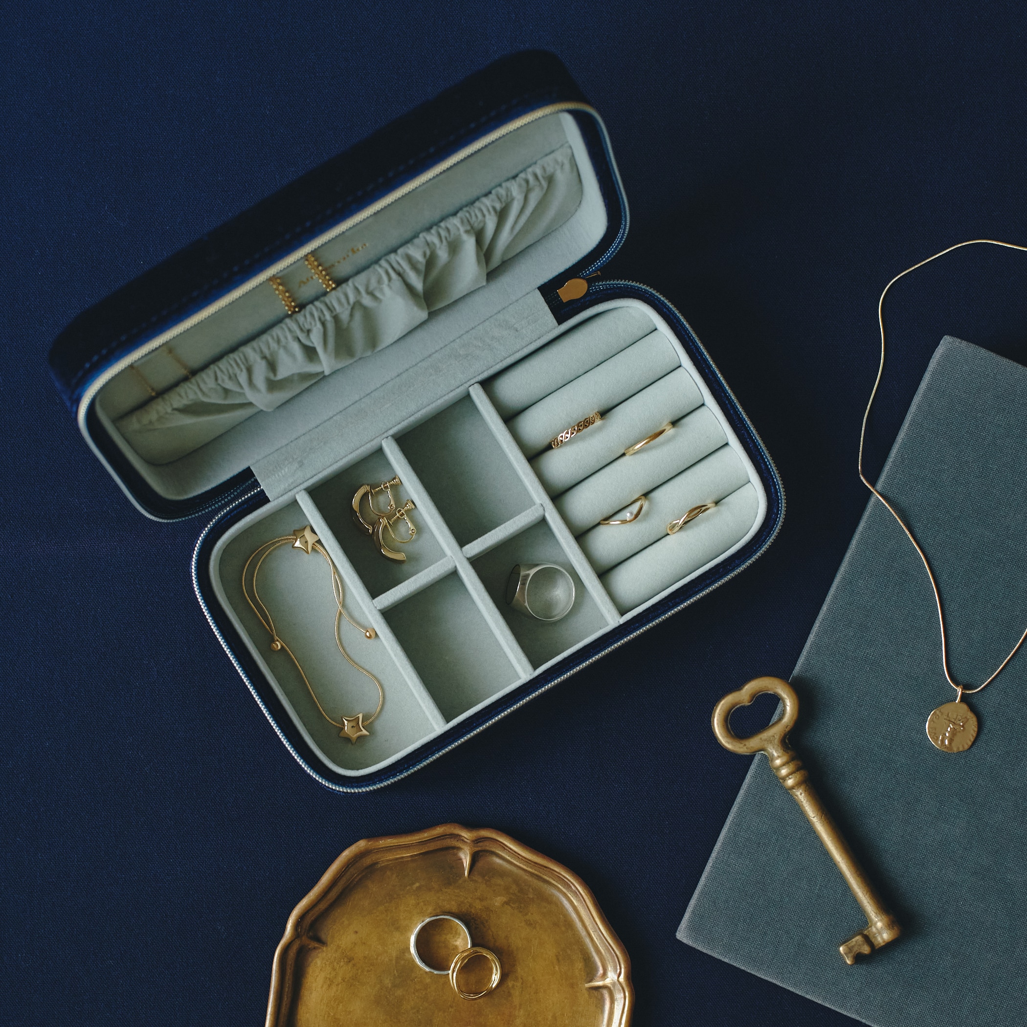 たくさんのジュエリーをすっきりと整理したい方におすすめなLサイズは、ファスナー仕様のため開閉しやすく、蓋部分と底部分の両方にジュエリーを収納できるのが便利です。