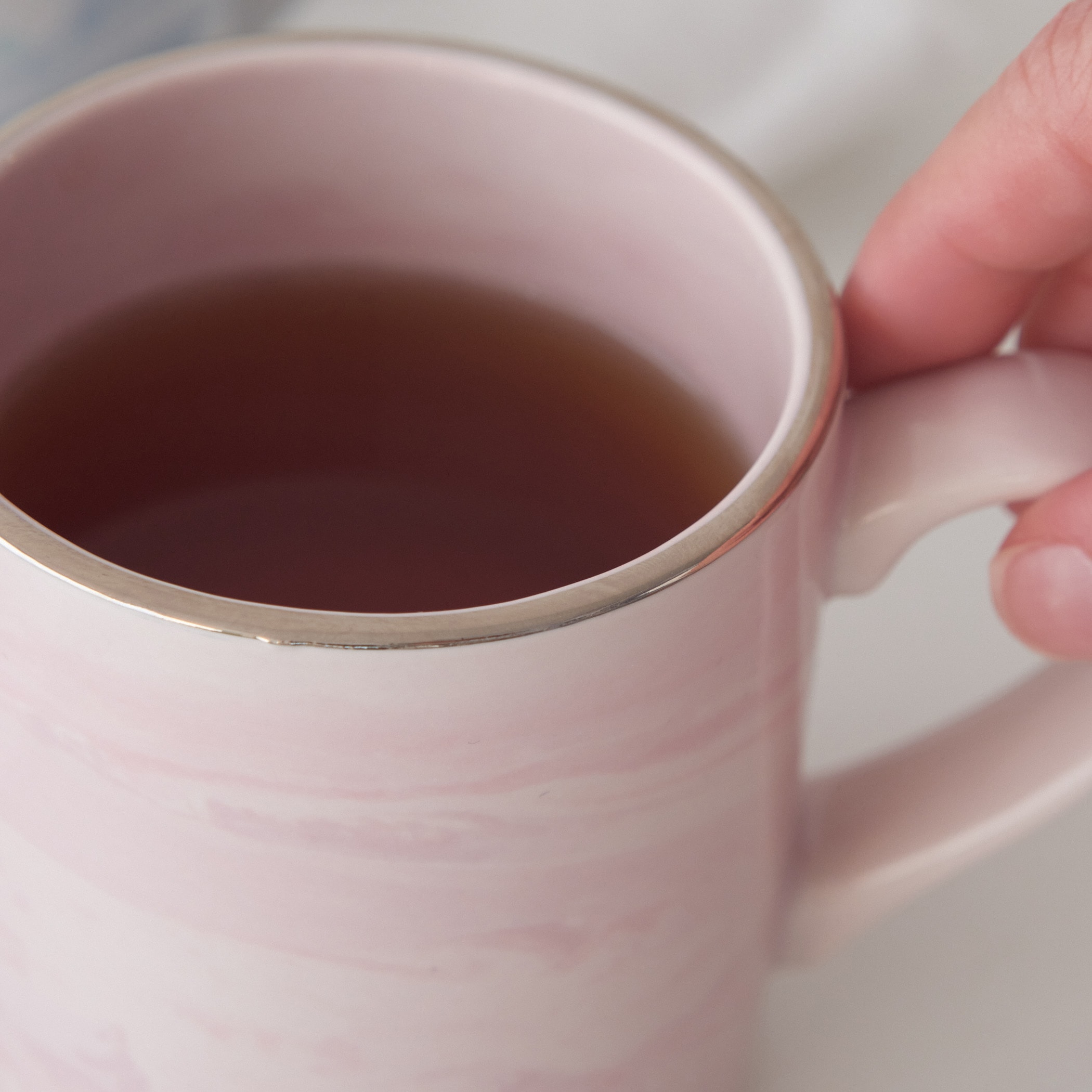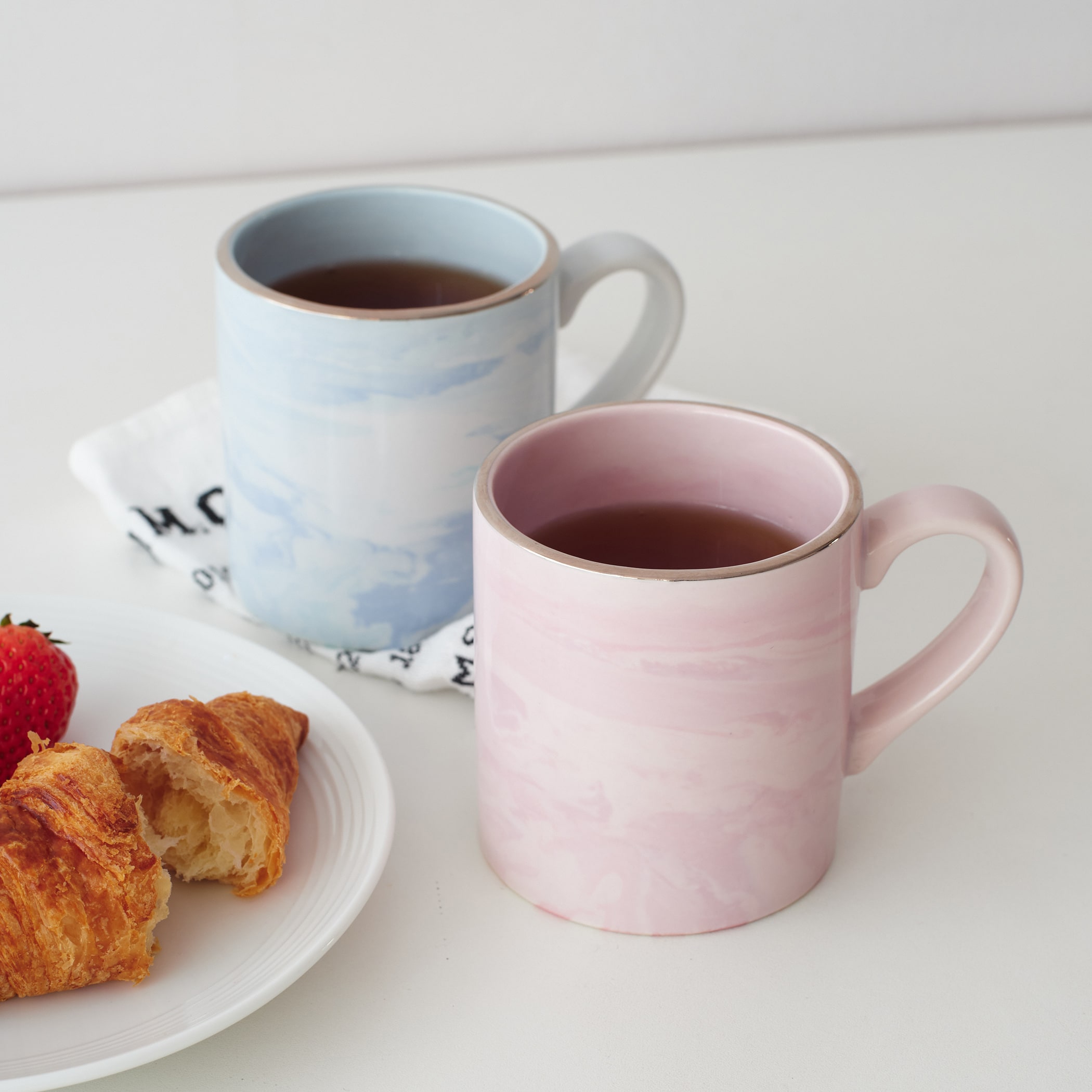 淡いマーブル柄が愛らしいマグカップ。ピンクは「恋焦がれ」ブルーには「泡沫(うたかた)」と、ネーミングにもこだわりました。