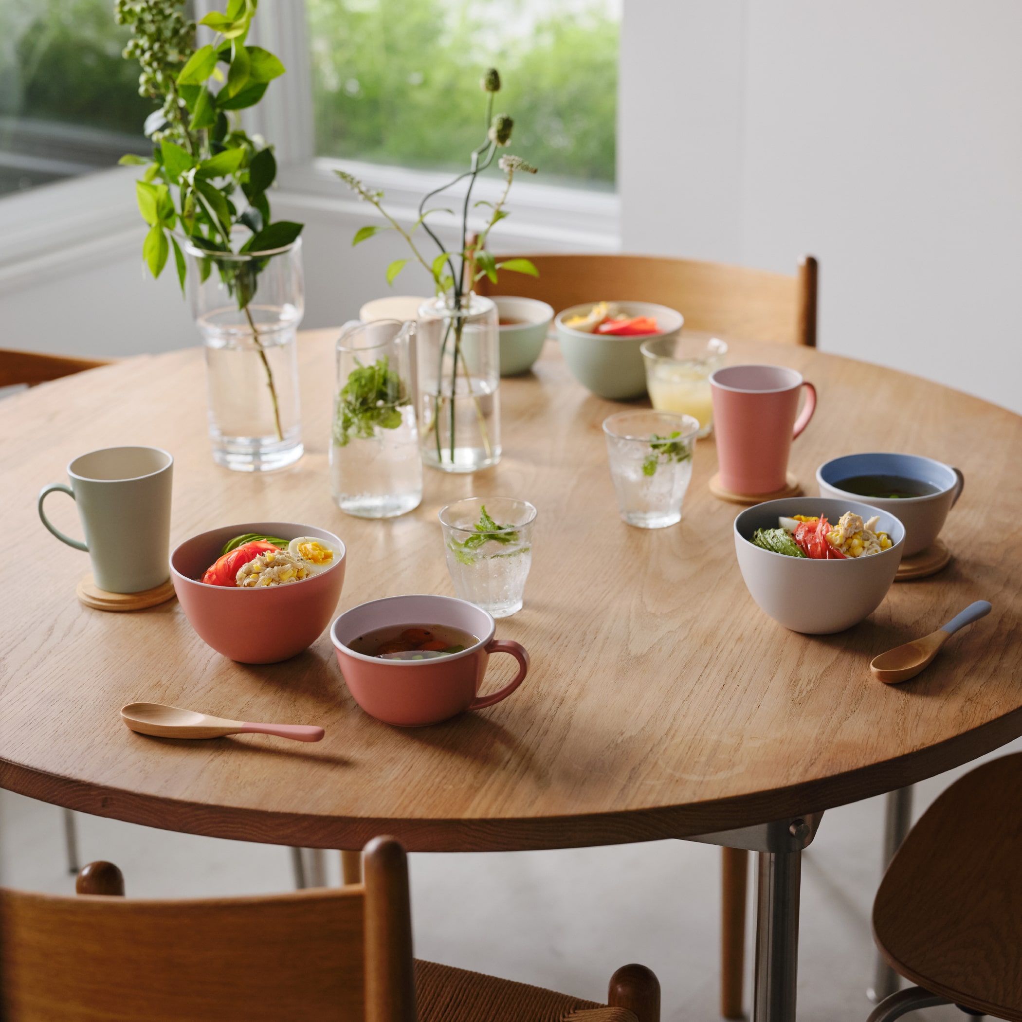 カラーリングは、グリーン・ピンク・グレーの3色をご用意。内側と外側で配色を変えているのもこだわりのポイント。同系色で揃えたり、色の組み合わせを変えてテーブルコーディネイトを楽しむのもおすすめですよ。