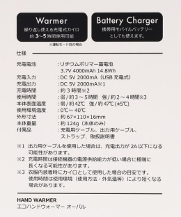 商品注意事項 | 付属品/充電用ケーブル、出力用ケーブル、ストラップ、取扱説明書(保証書) 充電入力/DC5V 2000mA(USB充電式) 充電出力/DC5V 2000mA 充電電池/リチウムポリマー蓄電池3.7V 4000mAh 14.8Wh 充電時間(約)/3時間 使用時間(約)/弱:3~5時間、強:2~4時間 本体表面温度(約)/弱:42℃、強:47℃(±5℃) 使用環境温度/0~40℃ ご使用の前に、取扱説明書をよくお読みのうえ正しくお使いください。 |