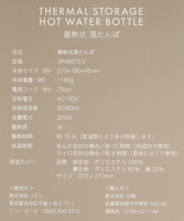 商品注意事項 | 付属品/蓄熱用電源ケーブル、保温カバー、取扱説明書(保証書) 定格電圧/AC100V 定格周波数/50/60Hz 消費電力/300W 蓄熱液/水 蓄熱時間の目安(約)/15分 使用有効時間の目安1(約)/あんか目的の場合10時間(布団内で使用) 使用有効時間の目安2(約)/カイロ目的の場合4時間(身体に当てて使用) 蓄熱は平らな場所で、保温カバーから取り出してから行ってください。 ご使用の前に、取扱説明書をよくお読みのうえ正しくお使いください。 |