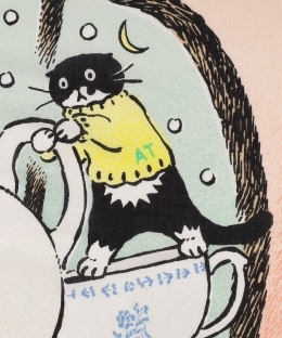 ティーウエアシリーズのモンレーヴティーポットを使ってお茶をサーブしているハチワレネコのアートが特別な癒しと遊び心を添えてくれます。大判サイズながらも生地が薄めなので、バッグなどにすっきりとしまえます。おでかけの際に使うのはもちろん、フラワーベースの下に敷いてインテリアとして楽しむのもおすすめです。