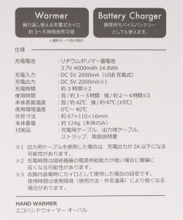 商品注意事項 | 付属品/充電用ケーブル、出力用ケーブル、ストラップ、取扱説明書(保証書) 充電入力/DC5V 2000mA(USB充電式) 充電出力/DC5V 2000mA 充電電池/リチウムポリマー蓄電池3.7V 4000mAh 14.8Wh 充電時間(約)/3時間 使用時間(約)/弱:3~5時間、強:2~4時間 本体表面温度(約)/弱:42℃、強:47℃(±5℃) 使用環境温度/0~40℃ ご使用の前に、取扱説明書をよくお読みのうえ正しくお使いください。 |