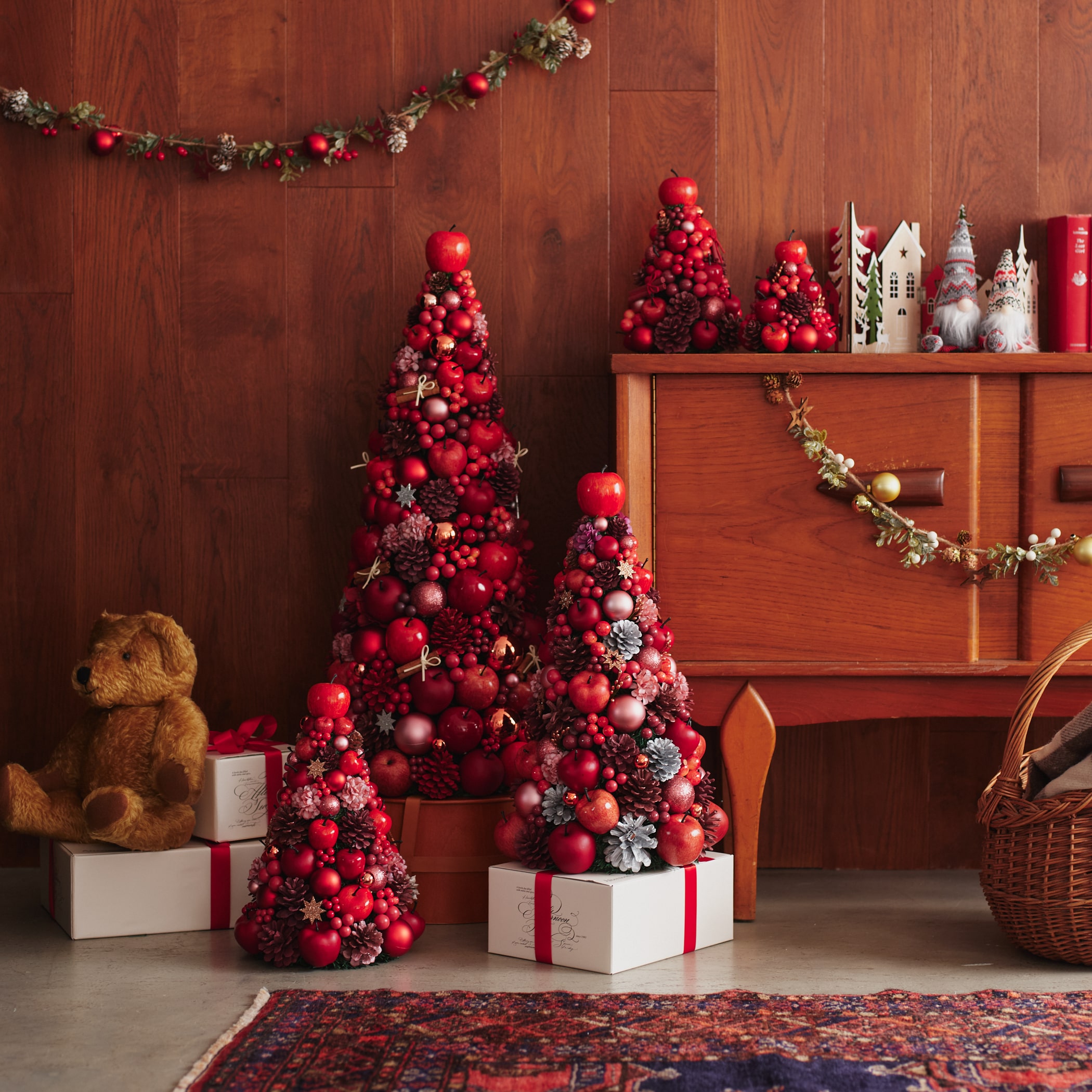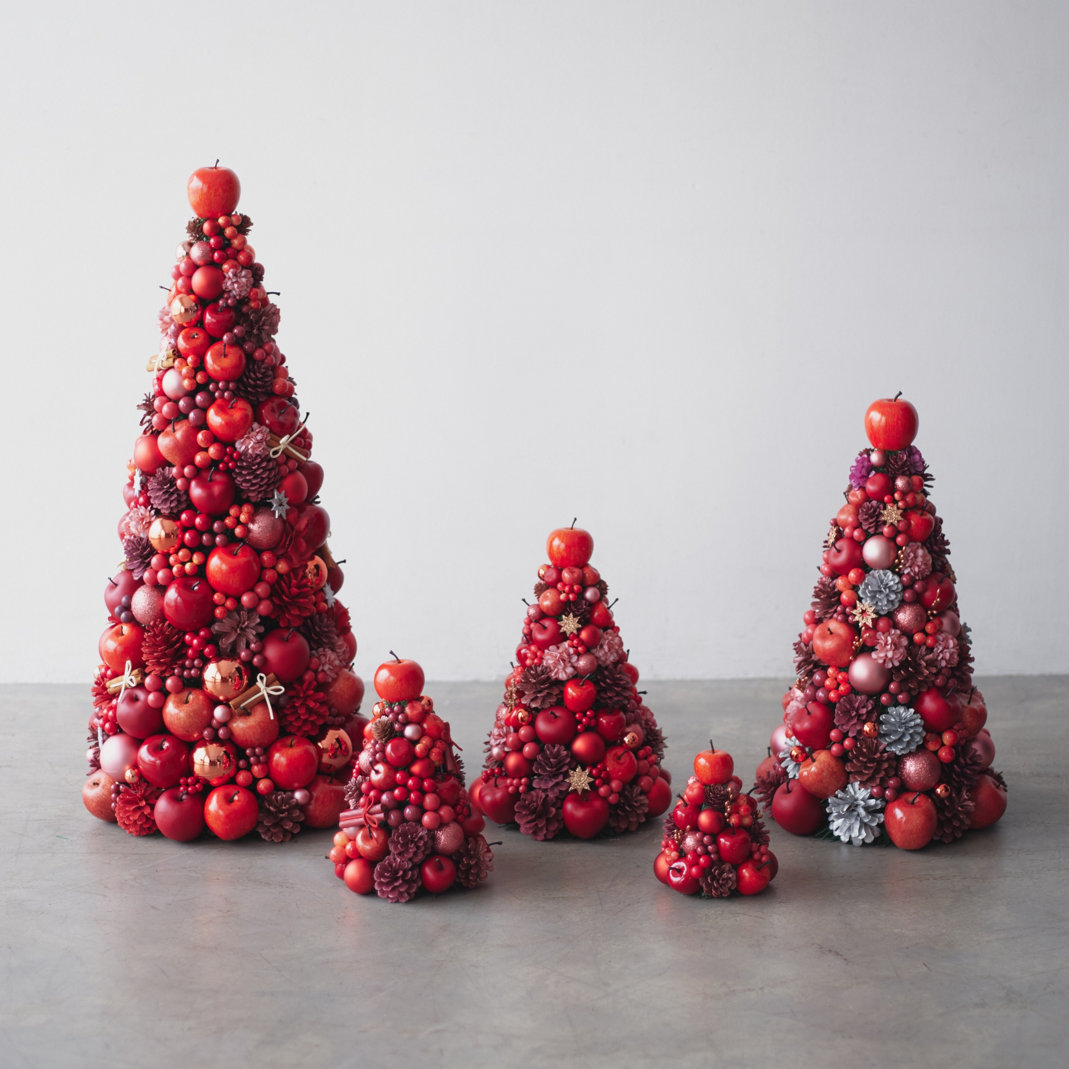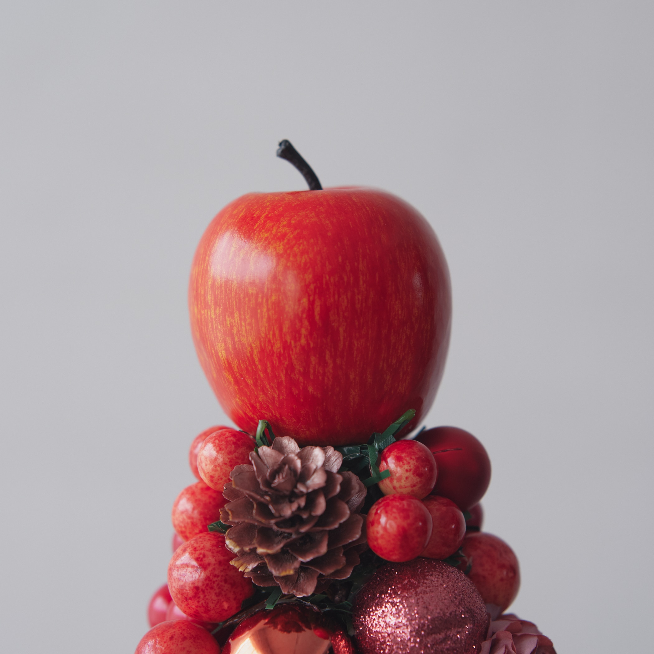 りんごをメインにシナモンや松ぼっくりなどナチュラルな素材をふんだんに使いながら、華やかさも忘れないデザインに仕上げました。ここでしか手に入らない、特別なツリーです。