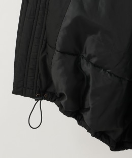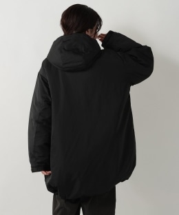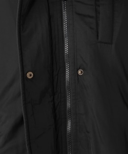 スタンドカラーの中にフードを収納すれば、すっきりとした見た目に。フロントはファスナーとスナップボタンを備え、防寒性もしっかり確保しました。袖口は面ファスナー、裾はドローコードでフィット感の調節ができ、冷気の侵入も防止します。
