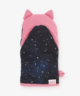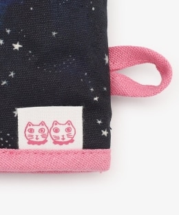 クリスマス仕様のキャラクターを施し、まるでパペットのようなデザインに仕上げました。ミトン本体に耳を付けたり、バックには星のアートを表現したりと、細かな部分まで北岸由美の世界観が詰まった1品。背面右下のイラスト入りネームタグもさりげないアクセントになっています。