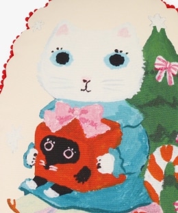 「クリスマス」をテーマにした色合いで、アートは年中飾っていただけるねこのデザインを描きました。それぞれのお部屋で想い想いにクリスマスを待つ様子をイメージしており、見ている側もワクワクしてきます。ふっくらとやわらかな詰め物で抱き心地にもこだわりました。絵本のような世界観をぜひおうち時間でお楽しみください。