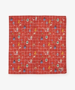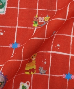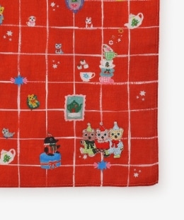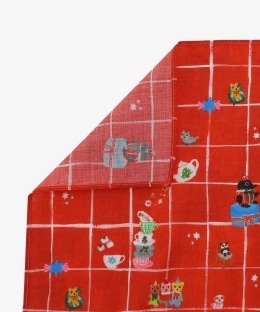 小さくてかわいらしい動物やモチーフをちりばめた特別なアートを描いていただきました。右下に添えたワンポイントの刺繍も素敵なアクセント。大判タイプかつ薄手でやわらかいコットン素材なので、手を拭くのはもちろんランチボックスを包むのにもぴったりです。