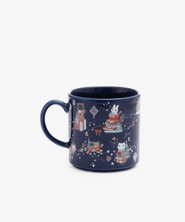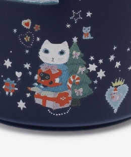 ネイビーベースにコントラストの効いた星柄やキャラクターのアートをあしらい、クリスマスの華やかなムードを想像させるデザインに。飲み物を注いだ際、さりげなく見える内側のワンポイントなど、細かい部分にもオリジナリティーが光るアイテムです。食器洗浄機でお手入れ可能なほか、電子レンジでホットドリンクのあたため直しができたりと使い勝手の良さにもこだわりました。