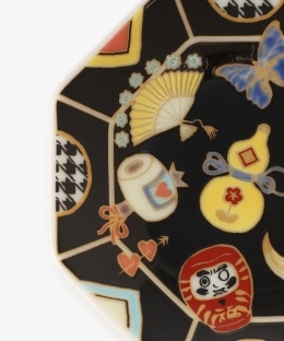 石川県能美市に位置する九谷焼の窯元「青郊窯」で作られる九谷焼を使用。さまざまな縁起の良いモチーフを組み合わせたデザインで、迎春の食卓を華やかに盛り上げます。転写紙を貼り付ける独自の技術により、手描きのような絵付けの風合いを実現。普段使いしやすいサイズ感で、醤油・薬味入れとしてもおすすめです。