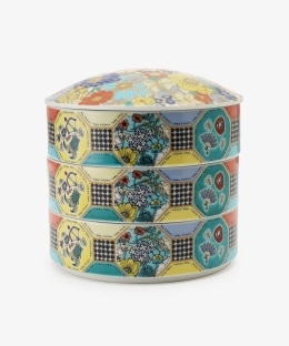 パリを拠点に活動するアーティスト、ナタリー・レテのアートをあしらった九谷焼の三段重です。石川県能美市に位置する九谷焼の窯元「青郊窯」で作られた器に、さまざまな縁起の良いモチーフをあしらった、華やかなデザインが魅力の一品です。