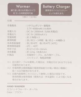 フラワーモチーフを総柄であしらい、ロマンティックなデザインに仕上げました。スイッチを入れてすぐに温まり、不要な時にはスイッチオフするだけの簡単操作です。充電器機能も備えているので、出先でスマートフォンの充電がなくなってしまった時にも便利。コンパクトなサイズ感で持ち運びやすく、寒い季節の通勤通学やスポーツ観戦など、さまざまなシーンで重宝します。