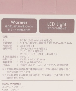 | 商品注意事項 | 付属品/充電用ケーブル、出力用ケーブル、ストラップ、取扱説明書(保証書) 充電入力/DC5V 1000mA(USB充電式) 充電電池/リチウムポリマー蓄電池3.7V 2000mAh 7.4Wh 充電時間(約)/3時間 使用時間(約)/カイロ3~4時間、ライト14時間、カイロ+ライト3~4時間 ライト光源/LED 本体表面温度(約)/42℃ 使用環境温度/0~40℃ ご使用の前に、取扱説明書をよくお読みのうえ正しくお使いください。 1点ごとに柄の出方が違うことがあります。 |