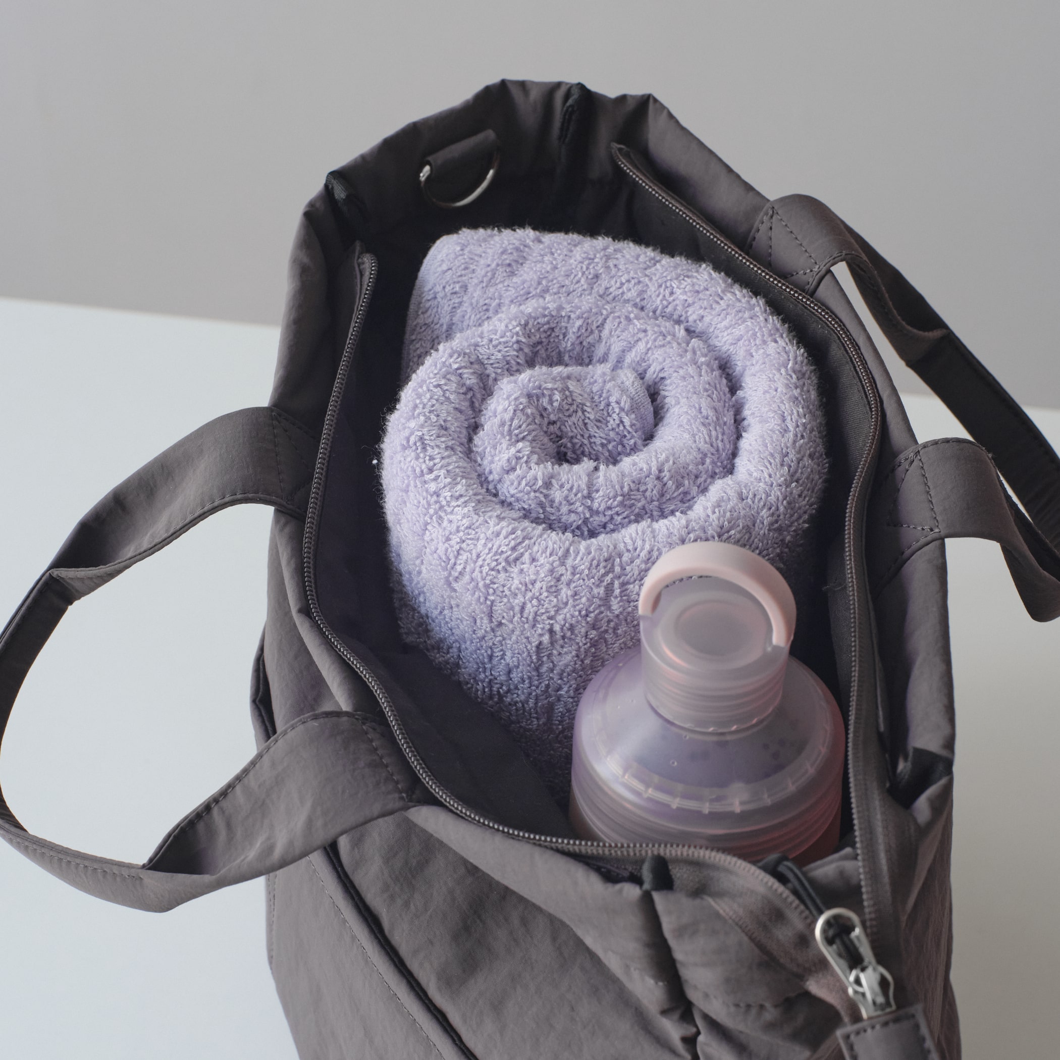 綿とマイクロファイバーを使用し、特許技術のダブルパイル構造で仕上げました。汗や水分を素早く吸い取ってくれるので、フィットネスやジムなどアクティブなシーンでも活躍します。抗菌防臭加工をしているため、かばんに備えておけば突然の雨にも便利。ゴムバンドが付属しており、本体をくるっとまとめられて持ち運びがしやすい仕様です。