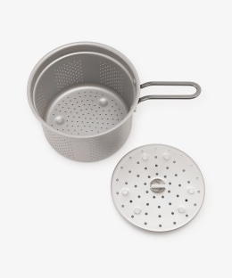 | 素材 | 本体:アルミニウム合金 内面:ふっ素樹脂塗膜加工 外面:焼付塗装(底面を除く) はり底:ステンレス鋼(クロム16%) 取っ手:フェノール樹脂 ガラスフタ:強化ガラス ツマミ:フェノール樹脂 ふち:シリコーンゴム ストレーナー:アルミニウム合金(表面、ふっ素樹脂塗膜加工) 取っ手:ステンレス鋼 蒸し器:アルミニウム合金(表面、ふっ素樹脂塗膜加工) リング:ステンレス鋼 |