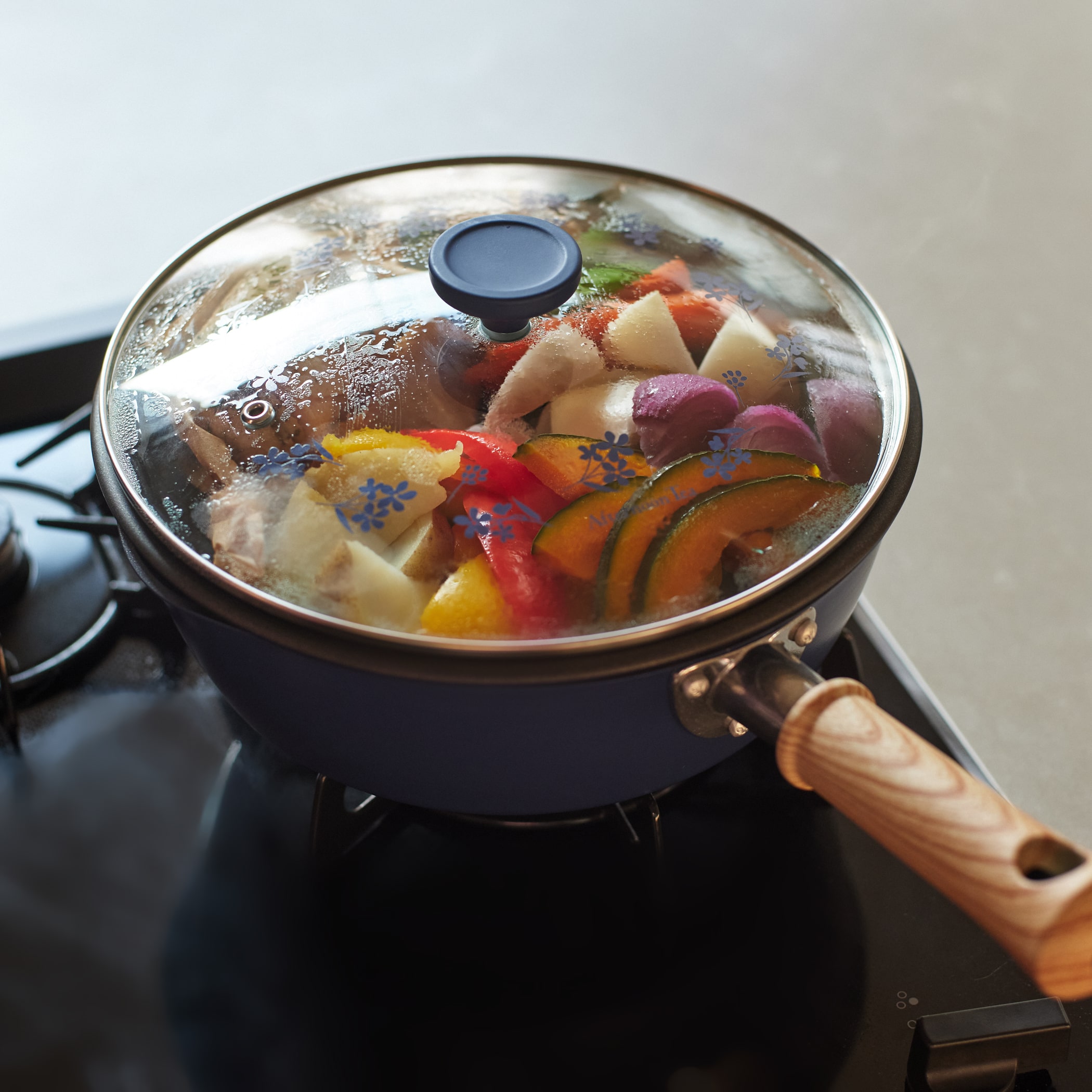 | 素材 | 本体:アルミニウム合金 内面:ふっ素樹脂塗膜加工 外面:焼付塗装(底面を除く) はり底:ステンレス鋼(クロム16%) 取っ手:フェノール樹脂 ガラスフタ:強化ガラス ツマミ:フェノール樹脂 ふち:ステンレス鋼 ストレーナー:ステンレス鋼 蒸し器:アルミニウム合金(表面、ふっ素樹脂塗膜加工) |