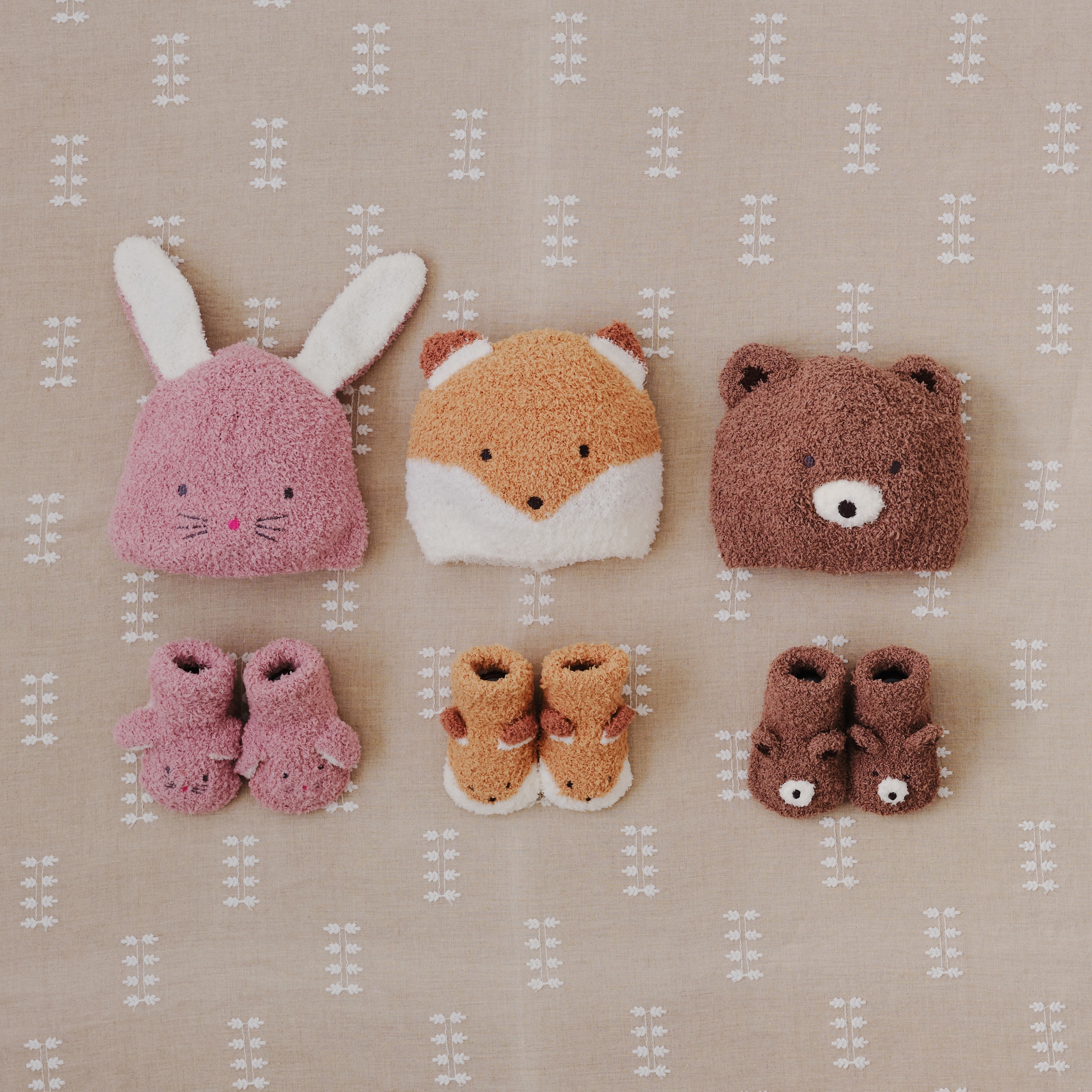 お揃いのデザインのニット帽やソックスもご用意。出産祝いなどにもおすすめのアイテムです。