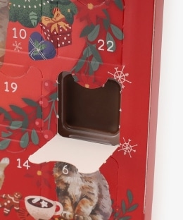 1から24までの日付に沿ってミシン目のついた窓を開けると、中から型押しされたおいしいチョコレートが出てくる仕様です。次はどんなデザインのチョコレートが出てくるのかわくわくしながら、クリスマス当日までを楽しくカウントダウンできます。紙箱裏面はメッセージカードとしても使えるため、ちょっとしたギフトとしてもいかがでしょうか。
