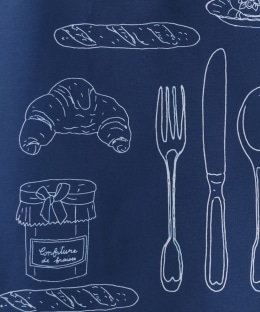 落ち着いたネイビーカラーを基調に、ティーカップやパンなどさまざまなモチーフをデザインしました。上品かつかわいらしい見た目で、幅広い世代におすすめのアイテムです。