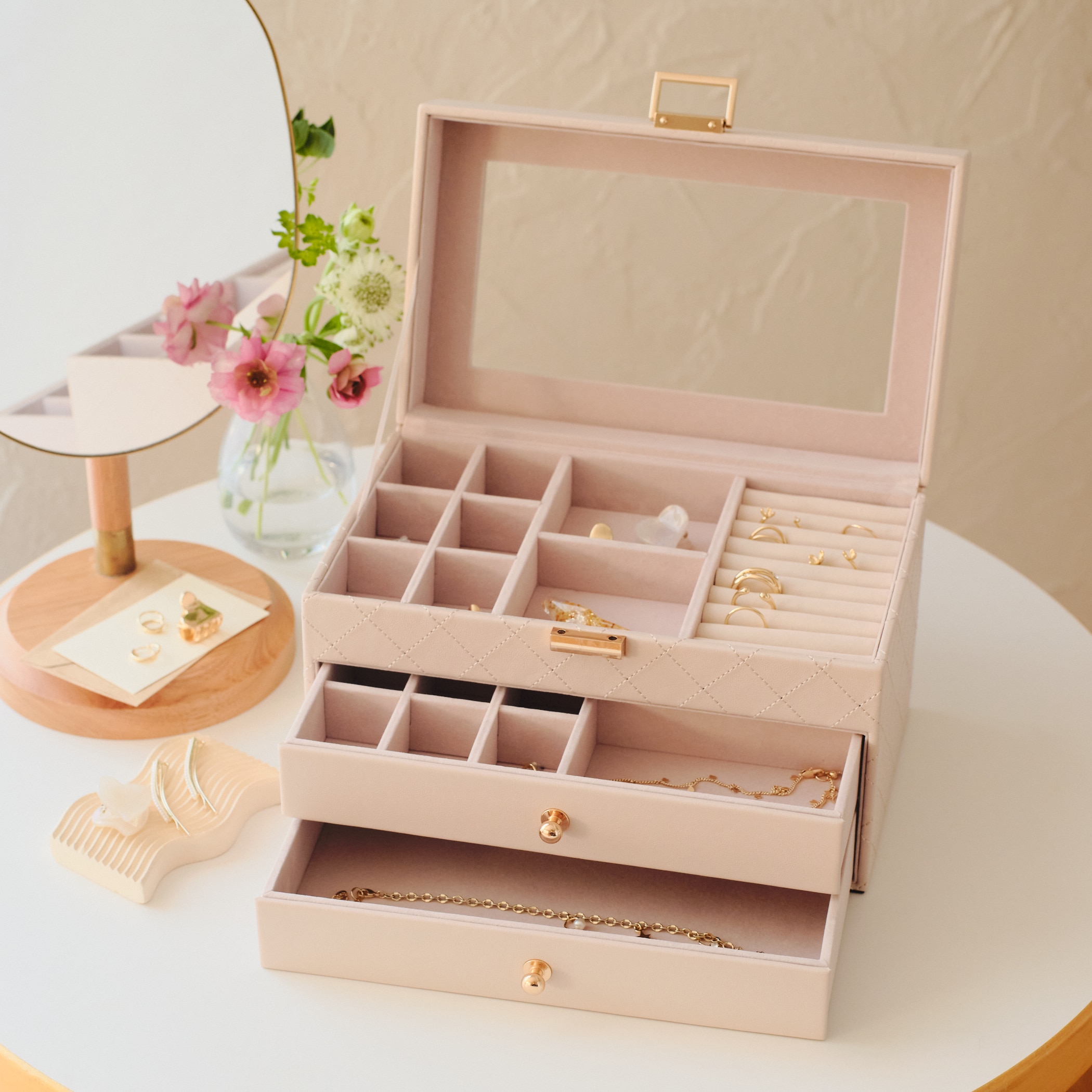 上品なキルティングデザインでインテリアにも馴染むジュエリーボックス。