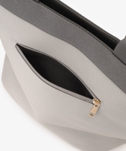 フランスで暮らす日々をイメージした、「MON JOURNAL(モンジャーナル)」シリーズのトートバッグです。「Un week-end à la campagne」(田舎での週末)がテーマのカラーリングです。 明るいグレーのバッグ地に合わせて「昼と夜の間の時間」という意味のタイポグラフィをエンボス加工であしらい、立体感をプラスしました。さり気ない遊び心を感じさせるデザインです。内外にファスナー仕様のポケットがあり、大切なものを仕分けて持ち運べます。ファスナー付きの間口で中身を隠せるので、プライバシーを守れるのもうれしいところ。マチ幅があるため、ランチボックスやマイボトルもすっきり入れてお使いいただけます。