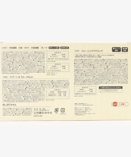| サイズ | 【箱】縦16.5cm/横28cm/厚み8.5cm 【小鉢】高さ4cm/直径12cm/容量290mL 【プレート】高さ2.3cm/直径14.9cm 【スプーン】長さ12.2cm/幅2.6cm 【フォーク】長さ11.9cm/幅2.2cm 【おしぼりタオル】縦32cm/横29cm 【トレーニングマグコップ】高さ7.3cm/横12.3cm/直径7.5cm/容量200mL |