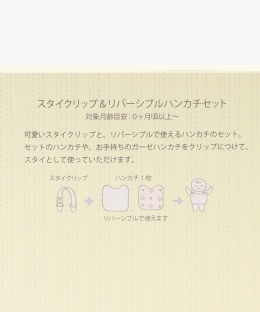 | サイズ | 【パッケージ】縦15cm/横15cm/厚み3.5cm 【スタイクリップ】全長(最大)44cm 【モチーフ】(クマ)縦4.5cm/横5.5cm(ホシ)縦4cm/横4cm 【ハンカチ】縦23cm/横22cm |