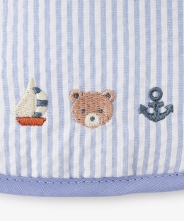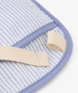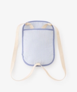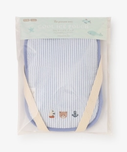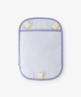 付属の保冷ジェルは、冷凍庫に入れてもカチカチに固まらず、柔らかいシャーベット状になるタイプ。赤ちゃんの背中や首元をやさしく、効率的に冷やしてくれます。付属の紐をポーチ背面のループに通すことで、リュックのように背負ったり、ベビーカーや抱っこ紐、チャイルドシートに固定したりと、シーンに合わせて5WAYで活用できるのが魅力です。ポーチ本体は丸洗いが可能なため、汗をかきやすい季節でも衛生的に保てます。さわやかなストライプ柄にくまのアルチュールの刺繍をあしらったかわらしいデザインで、夏のお砂遊びや移動時の熱中症対策にぴったりです。
