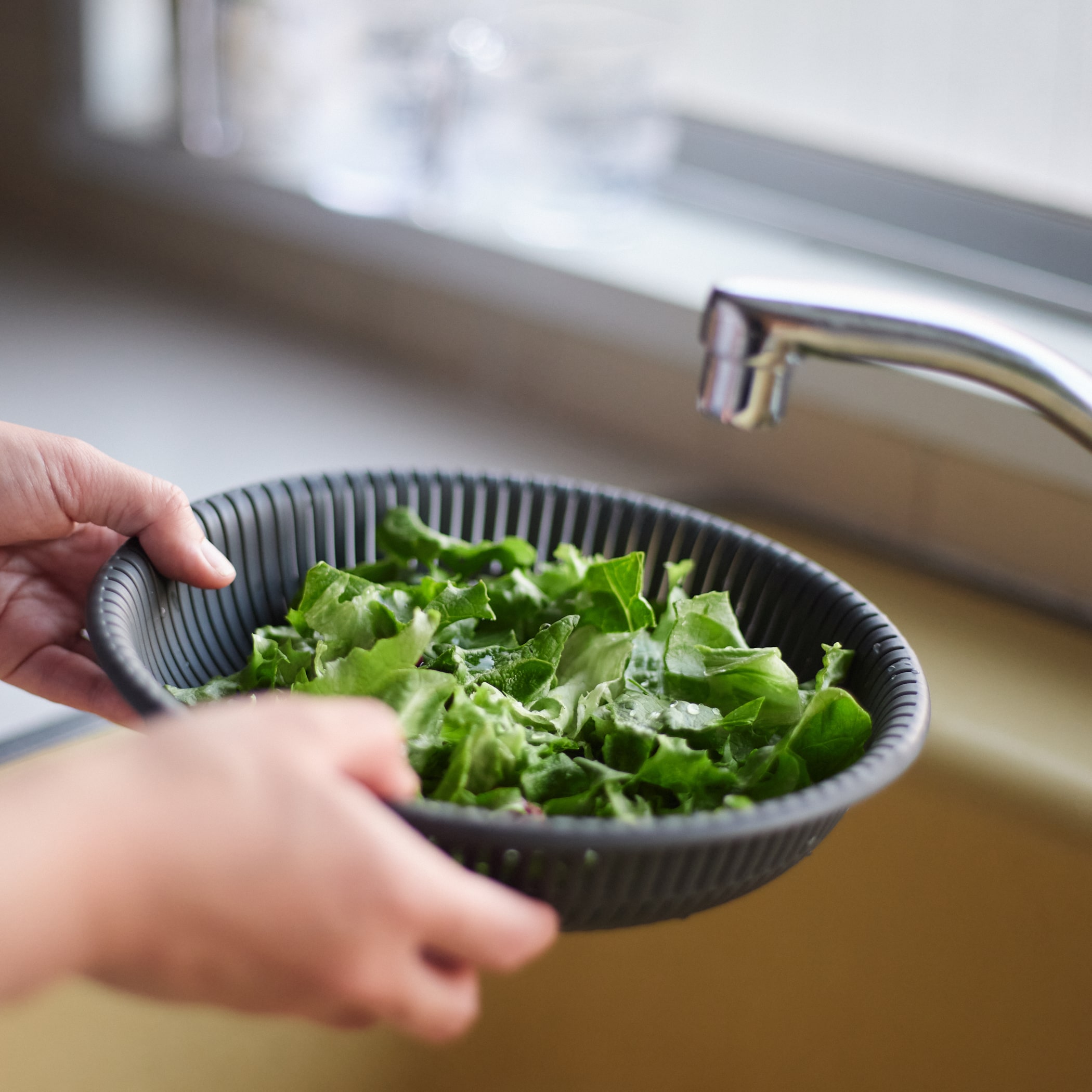 浅めのザルがついているので、ちょっとした野菜を洗ったり、ゆでた麺類、油揚げの油抜きなど、 効率よく水切りできます。