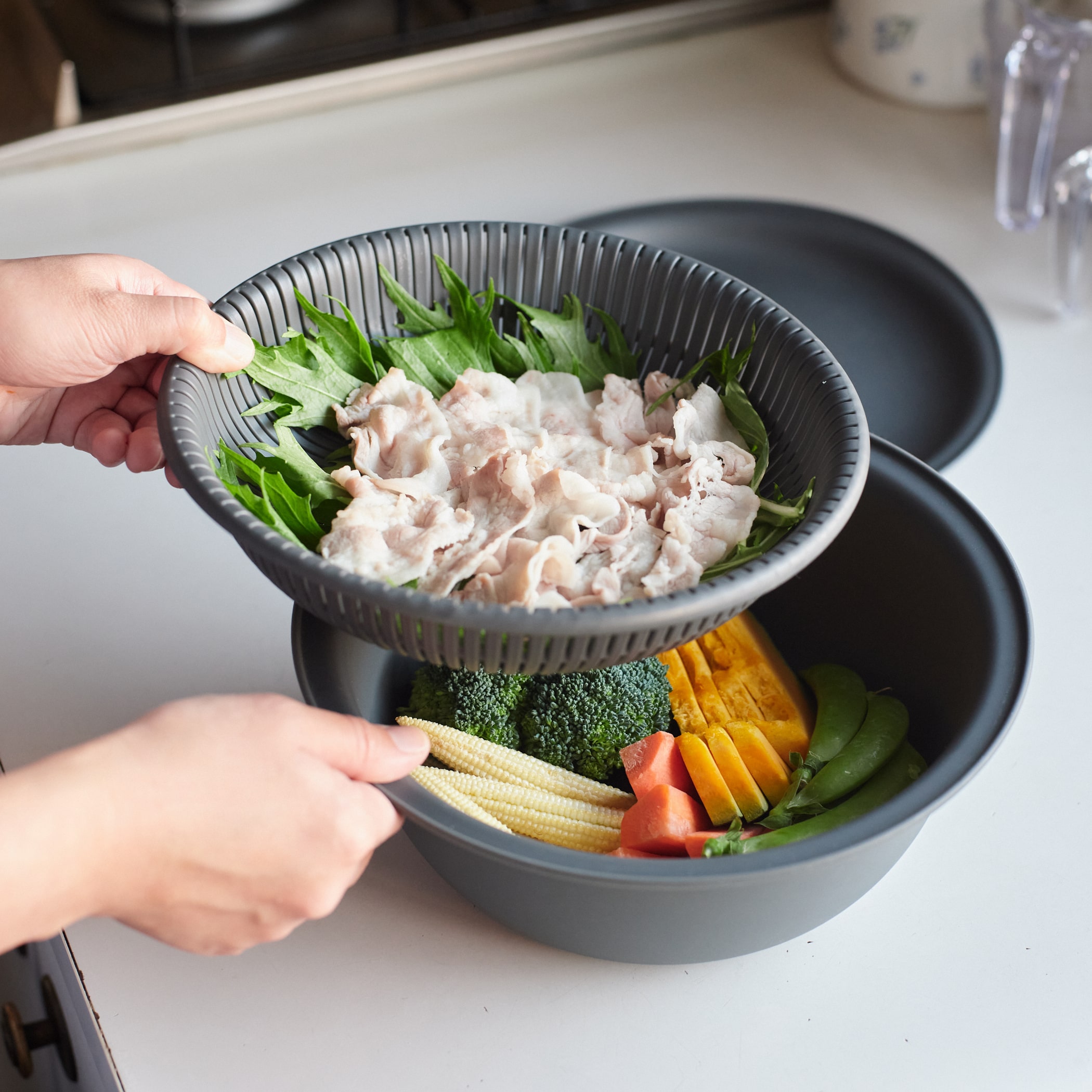 ザルとボウルの深さが違うので、2つの食材をそれぞれに入れて、1度に加熱することもできます。