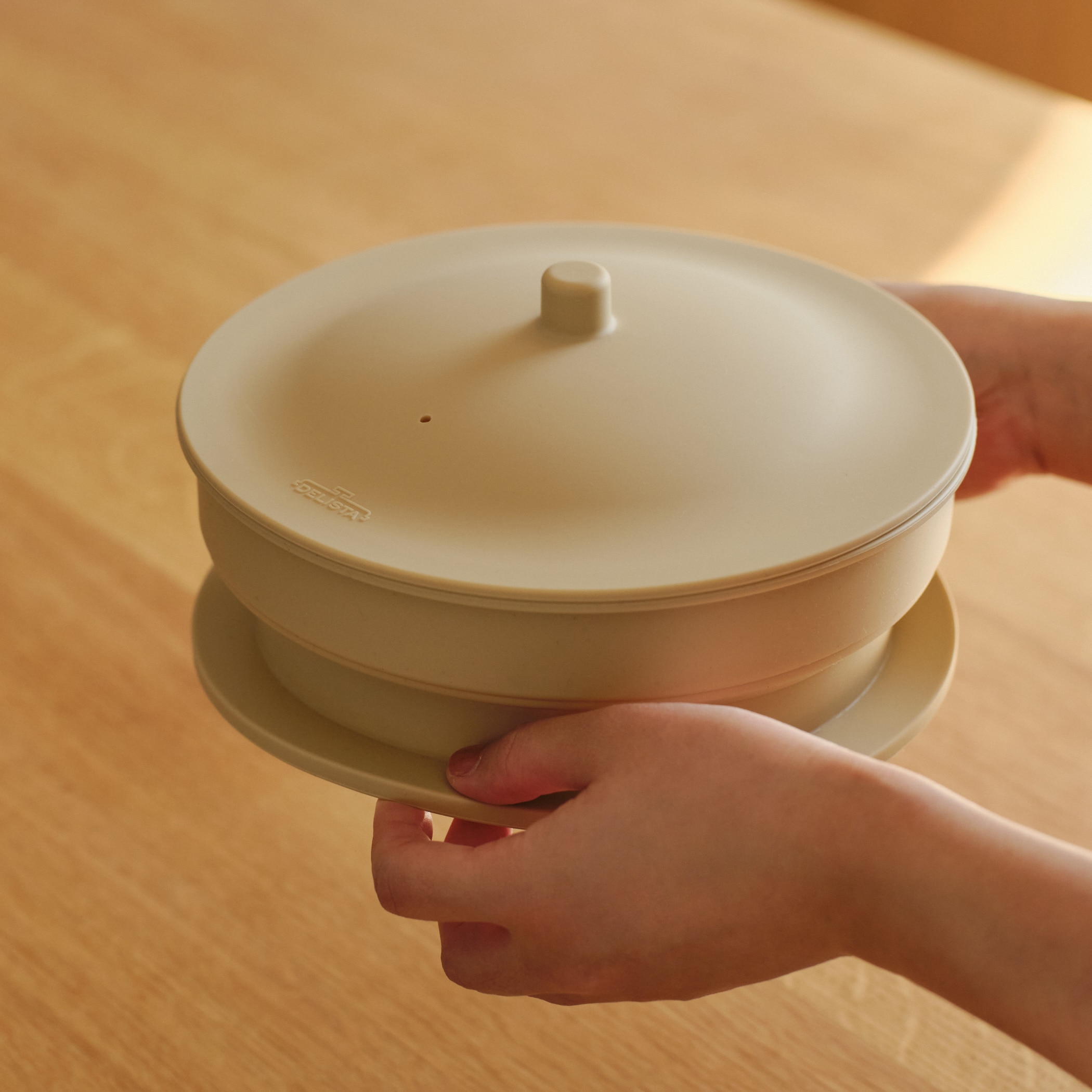 折りたたんでフタを逆さにすればコンパクトに収納できます。2個用意すれば2段重ねての同時調理にも対応し、場所を取らずマルチに活躍するキッチンアイテムです。