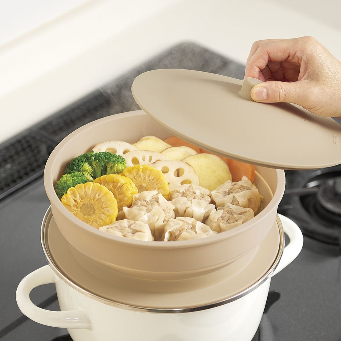 蒸し布やシートを使わずに、お手持ちの鍋にセットするだけで本格的な蒸し料理ができるシリコーン製スチーマー。