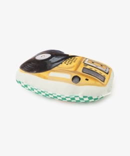 カセットテープを持つネコのアートをダイカットにしたクッションです。