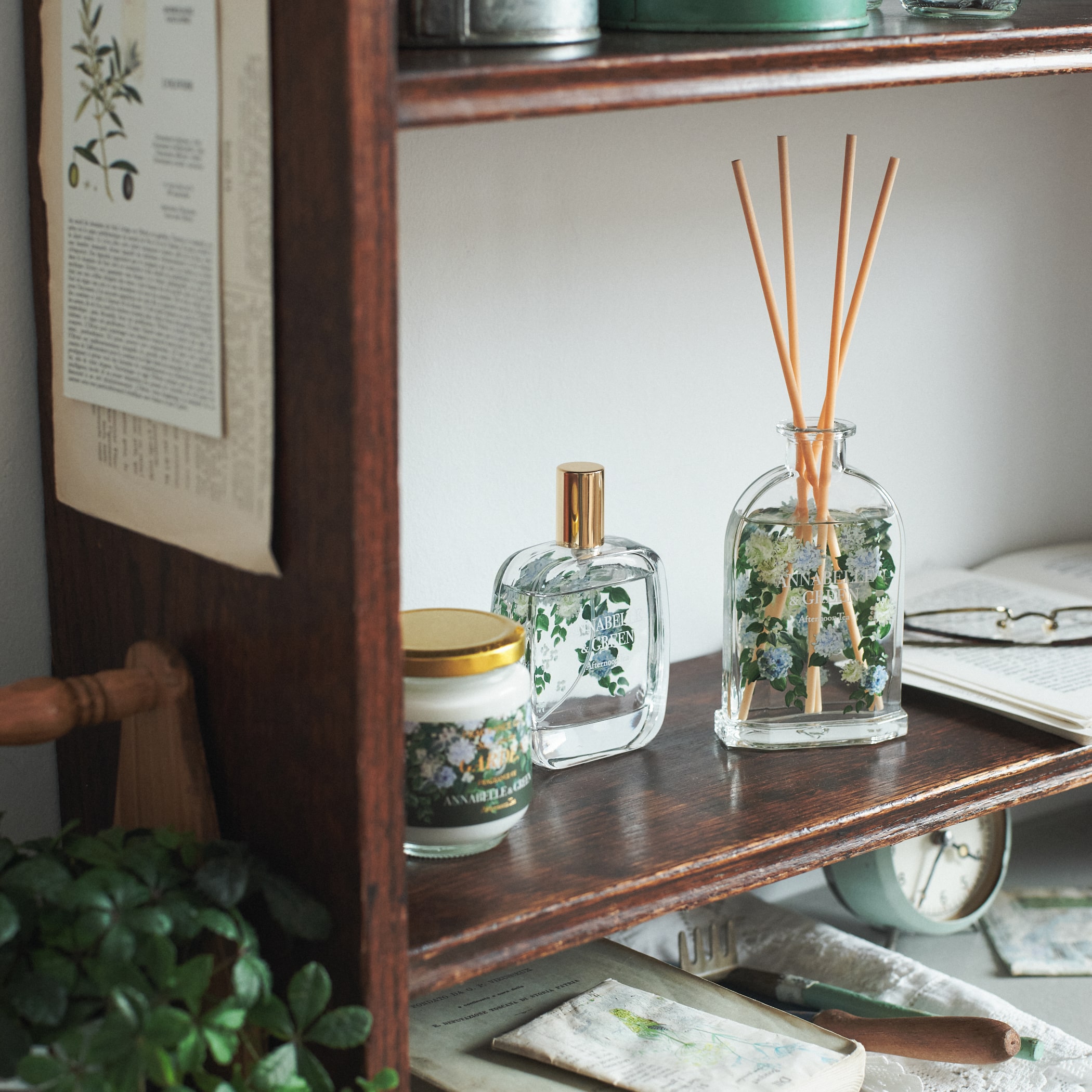 容器の両面に繊細な植物画をあしらった魅力溢れるデザインです。リビングや玄関先などに置く美しいインテリアとしても活躍します。時間経過により香りが変化するのもポイント。