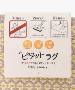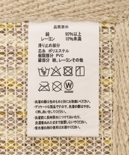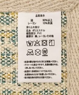 | 素材 | 本体:綿90%以上、レーヨン10%未満 滑り止め/芯糸:ポリエステル 樹脂部分:ポリ塩化ビニル樹脂 フチ:綿・レーヨン・その他 |