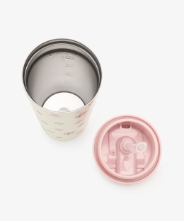 直飲みとストロー飲みの2WAYで使える仕様になっています。少し高さがある大きめのサイズ感で、スポーツシーンや暑い時期のお出かけにもぴったりなアイテム。ステンレス製の真空二重構造で保冷と保温の機能を備えており、1年を通してお使いいただけます。フタにはチャームを付けられるので、自由にカスタムして楽しむのもおすすめです。