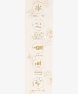 | 商品注意事項 | 付属品/充電用USBケーブル/Type-C、ネックストラップ、取扱説明書(保証書) 定格入力/DC5V/1000mA 内蔵電池/リチウムイオン蓄電池 3.7V 2500mA 9.25Wh 風量調節/4段階+リズム風 充電時間(約)/4.5時間(接続機器や環境により異なります) 連続使用可能時間(約)/3-10.5時間(ファンのみ使用時)、1時間自動OFF(ファン+冷却プレート) 本品はリチウムイオン蓄電池を使用しています。充電池の特性上、使用していなくても徐々に放電していく為、初回使用時に電源ボタンを押しても運転が開始されない場合があります。初回使用時は必ず充電してから使用してください。 充電する際は必ずそれぞれの機器の取扱説明書に記載された範囲の電源を使用してください。出力が不足したり過剰になると故障や作動の不具合、発熱、発火等の原因 となります。 急速充電には対応していません。 冷却プレートを一か所にあてる時間は5-10分程度にしてください。 箔加工製品は、摩擦や使用を繰り返すことにより表面の光沢が低下し薄くなることがあります。特性上、避けることができないため予めご了承ください。 ハンドクリームや薬品の付いた手でプリント部分を触ると剥離の原因となりますのでご注意ください。 付属の注意書きをよく読みご使用ください。 |