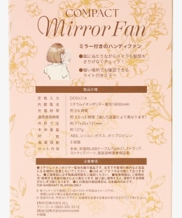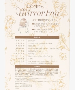 | 商品注意事項 | 付属品/充電用USBケーブル/Type-C、ストラップ、ストラップパーツ、取扱説明書(保証書) 定格入力/DC5V/1A 内蔵電池/リチウムイオンポリマー電池 1800mAh 風量調節/3段階 充電時間(約)/3.5時間(接続機器や環境により異なります) 連続使用可能時間(約)3.5-13時間(選んだ風量により異なります) 本品はリチウムイオンポリマー電池を使用しています。充電池の特性上、使用していなくても徐々に放電していく為、初回使用時に電源ボタンを押しても運転が開始されない場合があります。初回使用時は必ず充電してから使用してください。 充電する際は必ずそれぞれの機器の取扱説明書に記載された範囲の電源を使用してください。出力が不足したり過剰になると故障や作動の不具合、発熱、発火等の原因 となります。 急速充電には対応していません。 箔加工製品は、摩擦や使用を繰り返すことにより表面の光沢が低下し薄くなることがあります。特性上、避けることができないため予めご了承ください。 ハンドクリームや薬品の付いた手でプリント部分を触ると剥離の原因となりますのでご注意ください。 付属の注意書きをよく読みご使用ください。 1点ごとに柄の出方が違うことがあります。 |