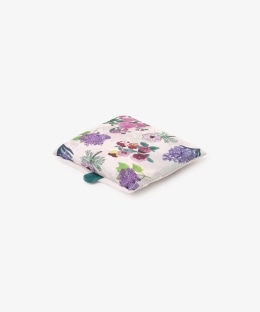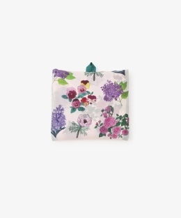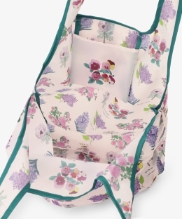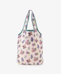 淡いピンクをベースに、パンジーなど色とりどりの可憐な花のイラストが一面に描かれています。縁取りには深みのあるグリーンを合わせ、全体を大人可愛く引き締めました。内側には小物の整理に便利なオープンポケット付き。使わない時は折りたたんでコンパクトに収納できるため、いつものバッグに入れておけば毎日のお買い物やサブバッグとして幅広く活躍します。