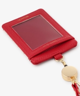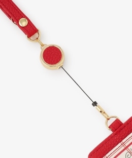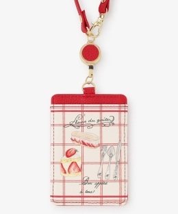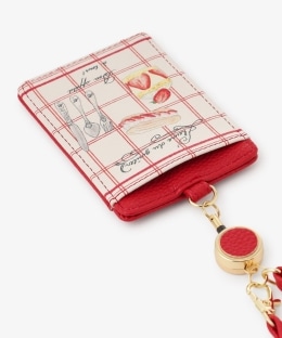 赤いチェック柄をベースに、ショートケーキやエクレアなどのスイーツモチーフが描かれています。ナスカン式のストラップが付いており、バッグの持ち手や内部のタブなどに引っ掛けて持ち歩きが可能。コードリール式で伸びるので、バッグに下げたまま楽々タッチができます。クリアウィンドウだけでなく、カードが入るポケットを備えているのもうれしいポイントです。