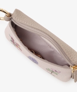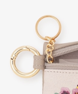 落ち着いたカラーをベースに、パンジーやヒヤシンス、アネモネといったシックな花柄とフランス語が描かれています。外側にクリアウィンドウ、内側にキーリングを備えた実用的な仕様。鍵やカードなどをマルチに収納できるので、身軽に外出したいときに活躍します。丸カラビナを備えており、お手持ちのバッグに装着して持ち運べるのも魅力です。